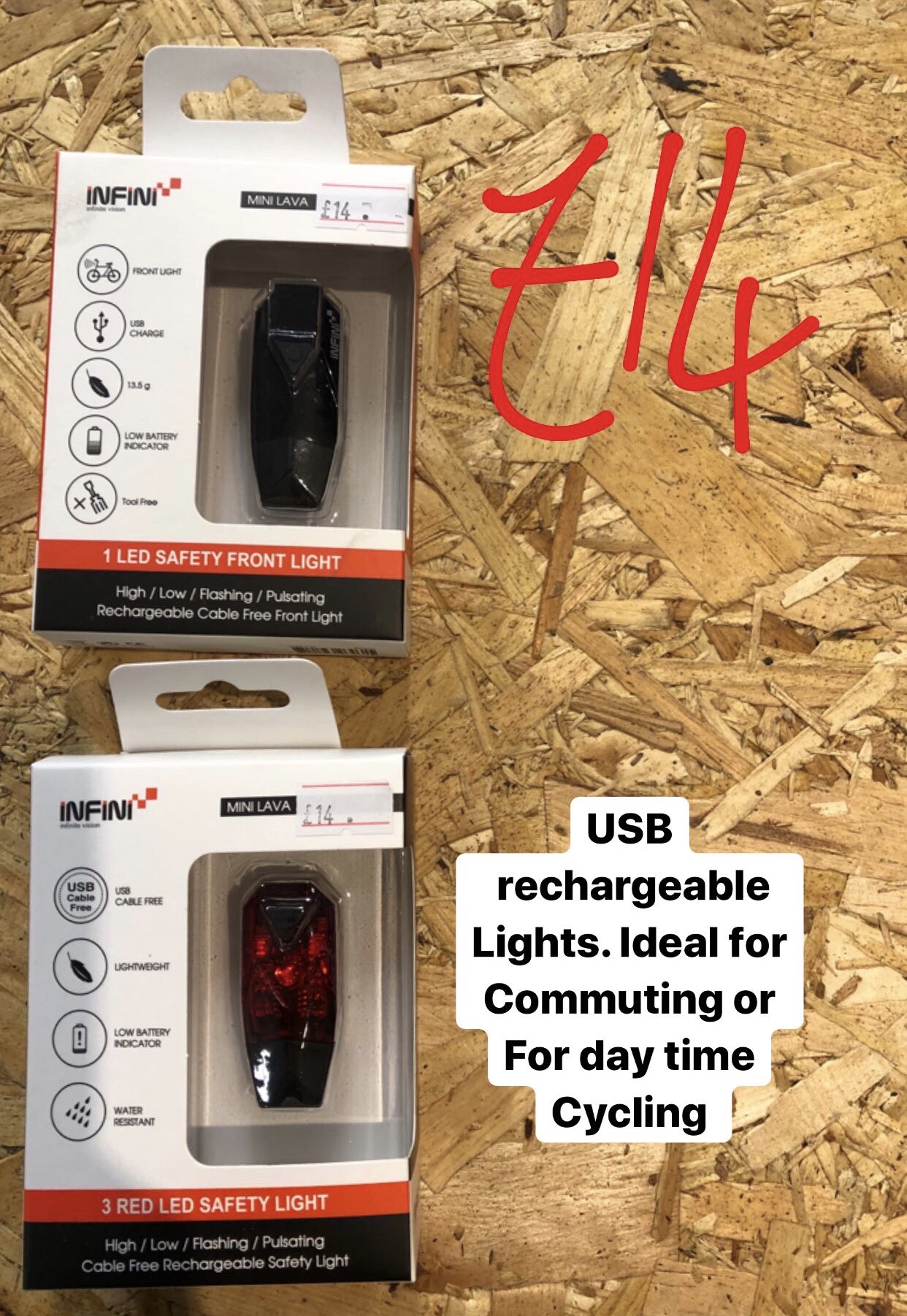 USB rechargeable lights, £14 each. Idea for the commuter or anyone cycling during the day.